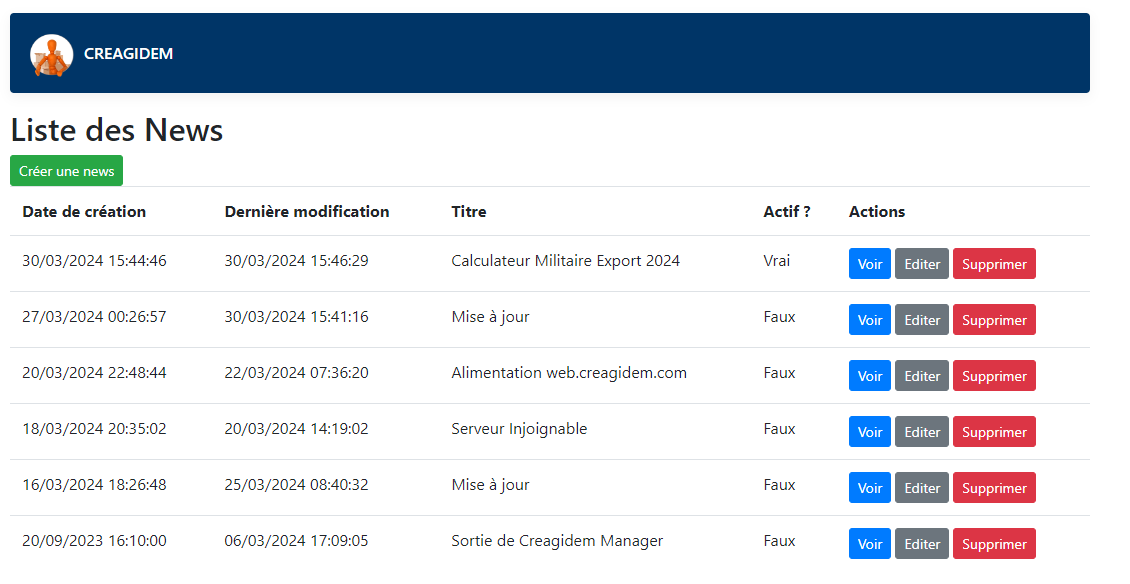 C’est une application web qui permet la création, modification et suppression de patch, alimenté par l’API de CREAPI cette application elle aussi en production permet à l’entreprise de gérer ses propres