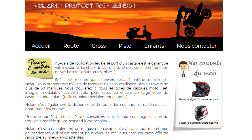 Le projet Nolark consiste en la création d’un site vitrine pour une entreprise de vente de casques de moto, visant à élargir la clientèle grâce à une présentation en ligne de sa sélection de produits disponibles à l’achat. Ce projet intègre des pratiques essentielles telles que la vérification des droits d’auteur, la validité des CGU et des cookies, répondant ainsi aux exigences légales et améliorant l’expérience utilisateur. Il comprend également le développement de tests unitaires en JavaScript avec jUnit pour assurer la qualité du code, et s’engage dans une démarche d’amélioration continue en réponse aux demandes spécifiques.